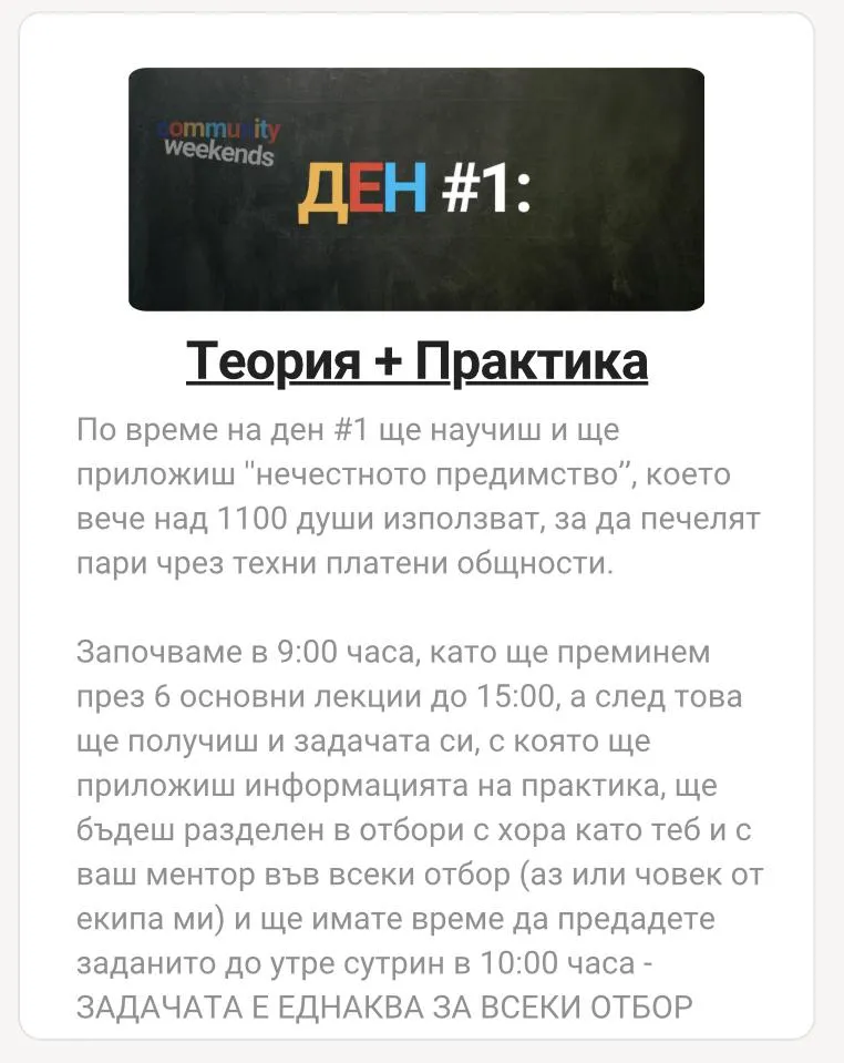 Тези 59 лв. са нищо в сравнение със знанията, с които ще разбереш как да стартираш успешен онлайн бизнес с платени общности за тези 2 дни.